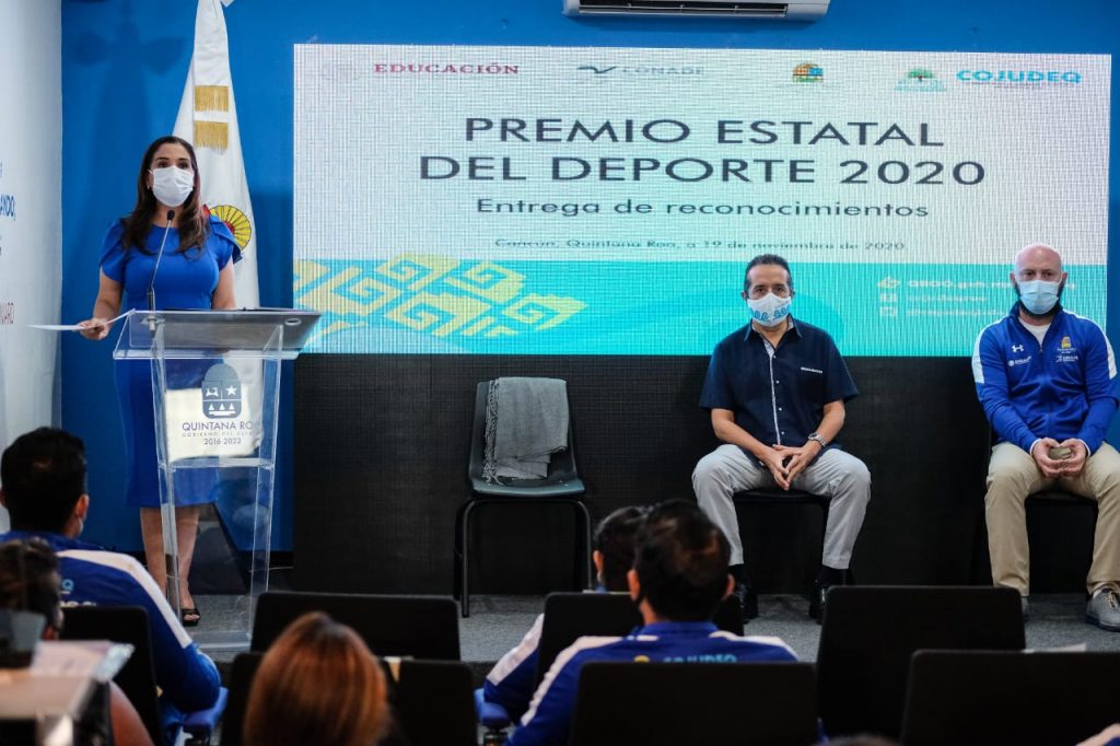 También congratuló al ganador del “Premio Estatal del Deporte 2020” en la modalidad de “Mejor Entrenador”, Sinhué Peniche Aragón, deportista cancunense, ocho veces campeón nacional de primera fuerza, siete veces seleccionado nacional y medallista de oro en los Juegos Panamericanos de Puerto Rico 2010; así como al ganador de la modalidad “Fomento Deportivo”, Alberto López Castro, gracias a su exitoso programa “De la calle a las canchas”.