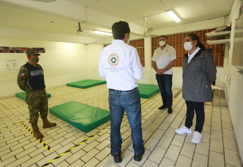 La Presidente Municipal de Benito Juárez, Mara Lezama, recorrió el refugio temporal designado en la secundaria general No. 19 “Benito Juárez”, en la Supermanzana 103, acompañada del Capitán de Fragata Plácido Paredes Martínez, de la Secretaría de Marina; el Segundo Inspector de la Guardia Nacional Teniente José del Carmen Reyes Melchor; el subdirector de área de emergencias de la Coordinación Nacional de Protección Civil, Mario Alberto Victoria Cárdenas; así como directores municipales.