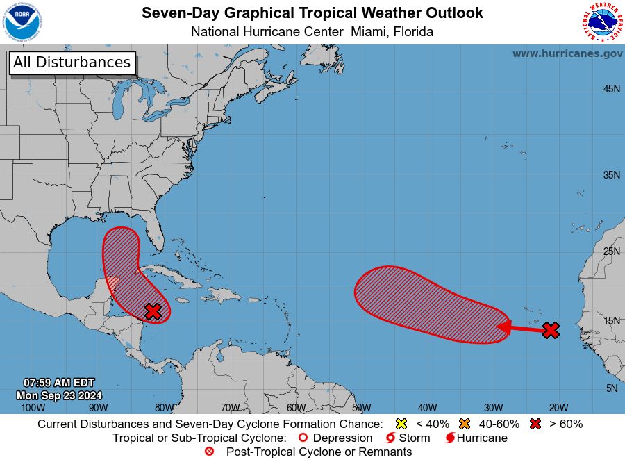 La primera zona de baja presión, localizada al este del Atlántico, incrementó su probabilidad de desarrollo ciclónico a 20% en 48 horas y a 70% en siete días. Este fenómeno se desplaza hacia el oeste-noroeste y, hasta el momento, no representa una amenaza para las costas de Quintana Roo.