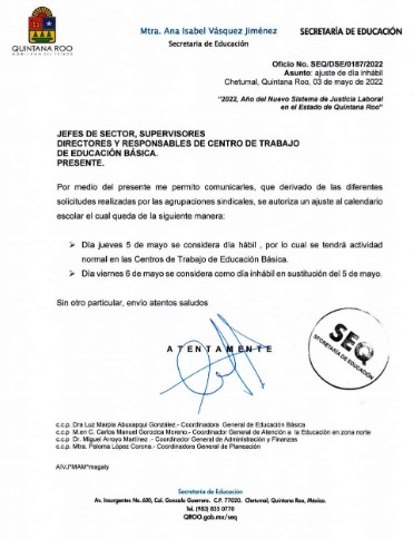 PODER Y CRÍTICA | REDACCIÓN | Por medio de una circular, la Secretaría de Enseñanza en Quintana Roo (SEQ) hizo saber una modificación al calendario estudiantil al recorrer al viernes 6 de mayo el día festivo del 5 en el cual se conmemora la Lucha de Puebla.