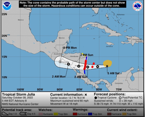 La COEPROC informó que de acuerdo con la información emitida por el Centro Nacional de Huracanes de Miami, Florida y difundida por el Servicio Meteorológico Nacional, sobre el seguimiento y vigilancia para el océano Atlántico, mar Caribe y Golfo de México; la Tormenta Tropical “Julia” a las 7 de la mañana se localizó en el mar Caribe aproximadamente a 1,235 kilómetros al este sureste de las costas de Quintana Roo.