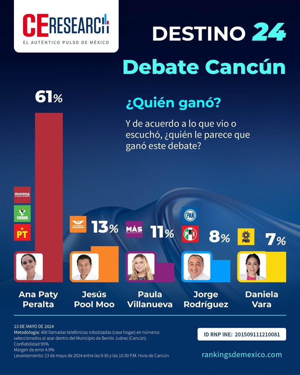 Las estadísticas colocaron a Pau Villanueva (MAS) en la tercera posición con el 11% de respaldo ciudadano después del debate, por encima de Jorge Rodríguez (PRI-PAN) y Daniela Vara (PRD), de acuerdo al reporte emitido por la encuestadora CE Reasearch.