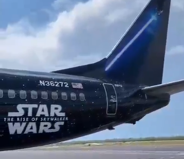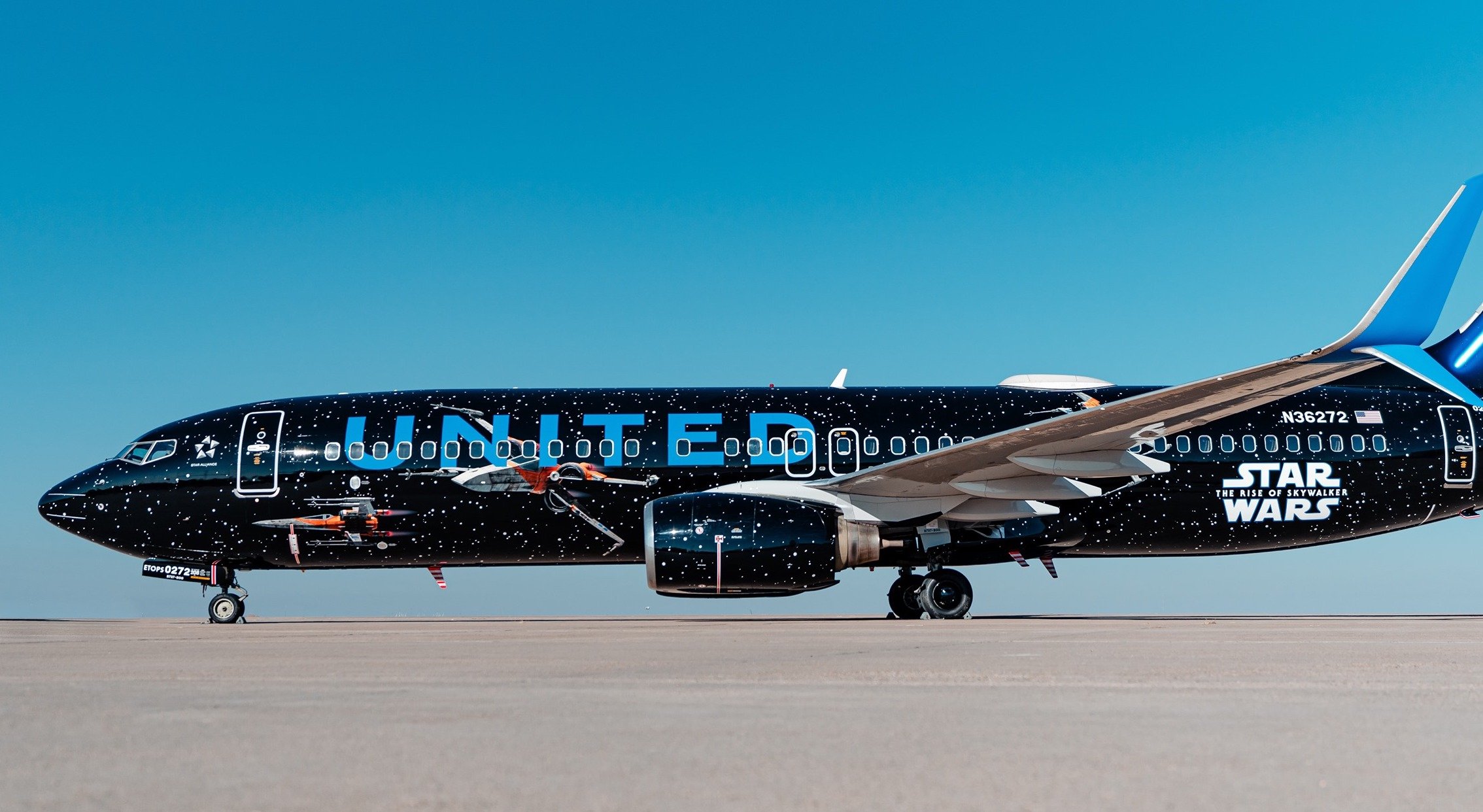 Este avión de la compañía United Airlines, fue pintado con el diseño que celebró el estreno de Star Wars: The Rise of Skywalker. Dejándolo con un fondo lleno de estrellas, la nave X-Wing y un caza TIE Fighter.