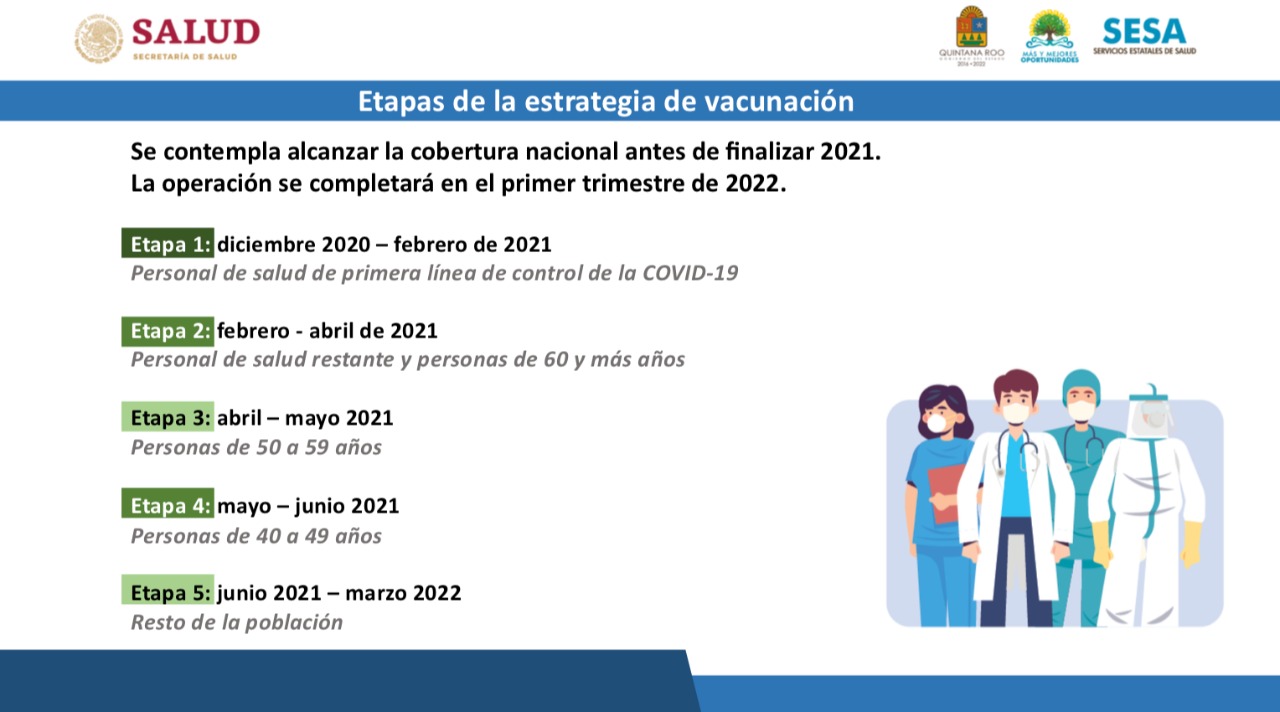 Se reitera que la vacunación contra la Covid-19 en México consta de 5 etapas. En la primera se vacunará al personal de salud de primera línea entre diciembre de 2020 y febrero de 2021. Este grupo es el que atiende a pacientes en áreas Covid-19 en hospitales.