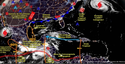 Tabasco, 10 septiembre; poderycrítica.-La interacción de una zona de inestabilidad con potencial ciclónico con la Zona de Convergencia Intertropical y un canal de baja presión en el Golfo de México manteniendo un potencial de lluvias generales muy fuertes a intensas de 75.1 a 150 mm en la subregión de Ríos y los municipios de Cárdenas, Huimanguillo, Macuspana y Paraíso, sin descartar Centro, así como lluvias torrenciales aisladas de 150.1 a 250 mm en La Sierra y el Norte de Chiapas.