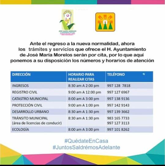 José María Morelos, Q. Roo, Domingo 16 de Agosto de 2020, poderycrítica.- Como medida de prevención ante la contingencia sanitaria por el SARS-COV2 y, en concordancia con el Gobierno del Estado que encabeza el Gobernador, Carlos Joaquín, la Presidenta Municipal, Sofía Alcocer Alcocer, instruyó se amplíe la suspensión de labores presenciales en las dependencias y oficinas del H. Ayuntamiento de José María Morelos, hasta el 31 de agosto del 2020.