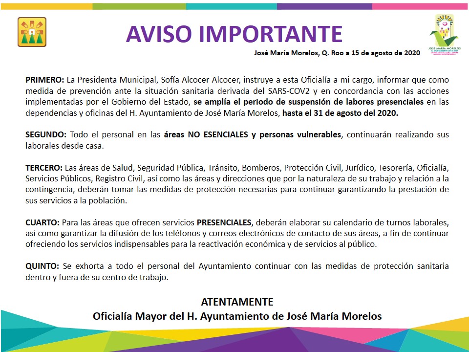José María Morelos, Q. Roo, Domingo 16 de Agosto de 2020, poderycrítica.- Como medida de prevención ante la contingencia sanitaria por el SARS-COV2 y, en concordancia con el Gobierno del Estado que encabeza el Gobernador, Carlos Joaquín, la Presidenta Municipal, Sofía Alcocer Alcocer, instruyó se amplíe la suspensión de labores presenciales en las dependencias y oficinas del H. Ayuntamiento de José María Morelos, hasta el 31 de agosto del 2020.
