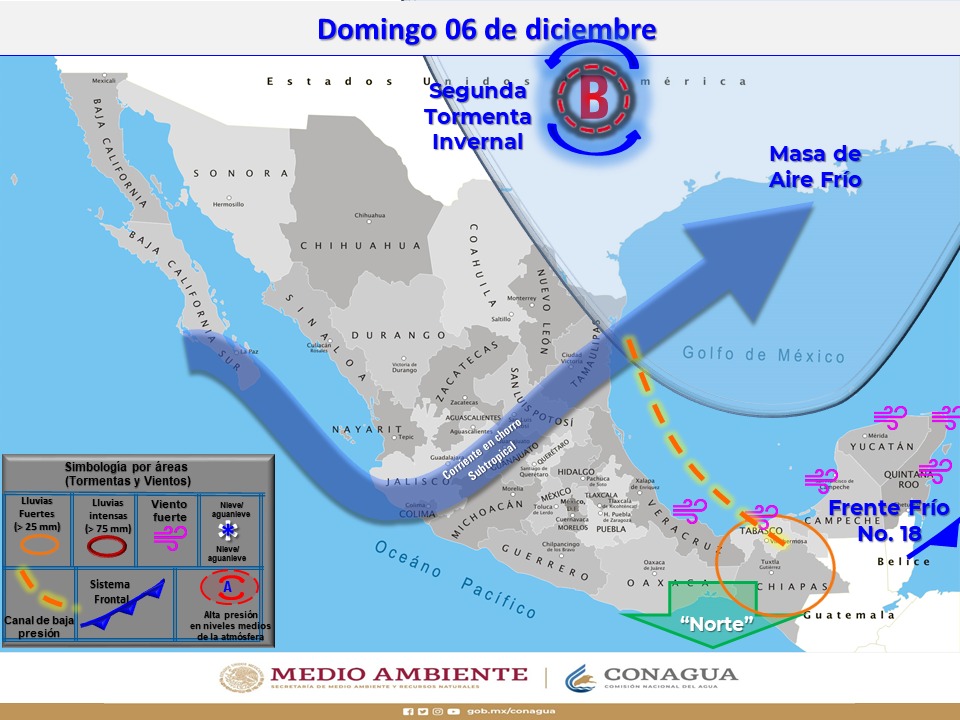 La segunda tormenta invernal se desplazará lentamente sobre el norte del país y la masa de aire polar asociada al frente, cubrirá gran parte de la República Mexicana y continuará interactuando con la corriente en chorro subtropical; estas condiciones mantendrán ambiente frío a muy frío sobre gran parte del territorio nacional, así como fresco matutino sobre Quintana Roo.