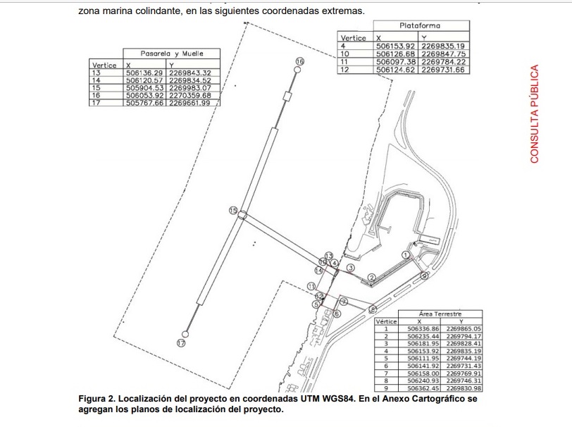 El Proyecto en específico será la construcción de un muelle en forma de “T”, construido sobre pilas o bloques de acero o concreto. El muelle ocupará un área total de 13 mil 545 metros cuadrados sobre la zona marina, formado por una plataforma inicial, una pasarela central de acceso de menos de 20 metros de ancho y aproximadamente 272 metros de longitud en su eje y dos muelles de atraque orientados hacia el norte y hacia el sur, ambos de aproximadamente 20 metros de ancho.