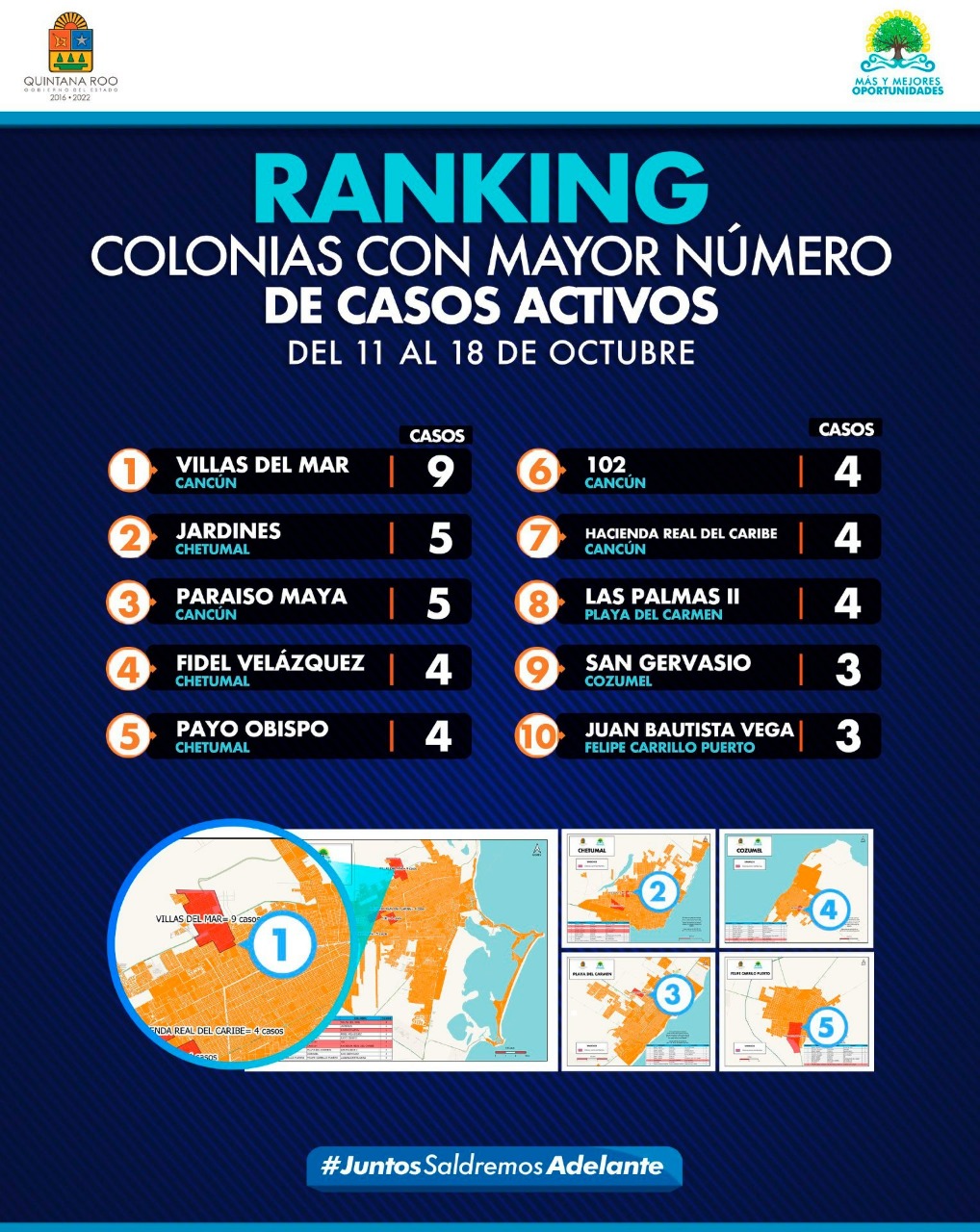 El gobernador señaló que los diez lugares con mayores casos de coronavirus son en primer lugar el fraccionamiento Villas del Mar en la ciudad de Cancún con 09 casos, le sigue en orden descendente la colonia Jardines de Chetumal con 05 casos; después está el fraccionamiento Paraíso Maya en Cancún con 05 casos; posteriormente le siguen la colonia Fidel Velázquez en Chetumal con 04 casos, la colonia Payo Obispo también de Chetumal con 04 casos, la región 102 de Cancún con 04 casos, el fraccionamiento Hacienda Real del Caribe también con 04 casos al igual que el fraccionamiento Las Palmas Dos ambas en Cancún con cuatro casos; le sigue la colonia San Gervasio de la isla de Cozumel con tres casos y la colonia Juan Bautista Vega del municipio de Felipe Carrillo Puerto también con tres casos.