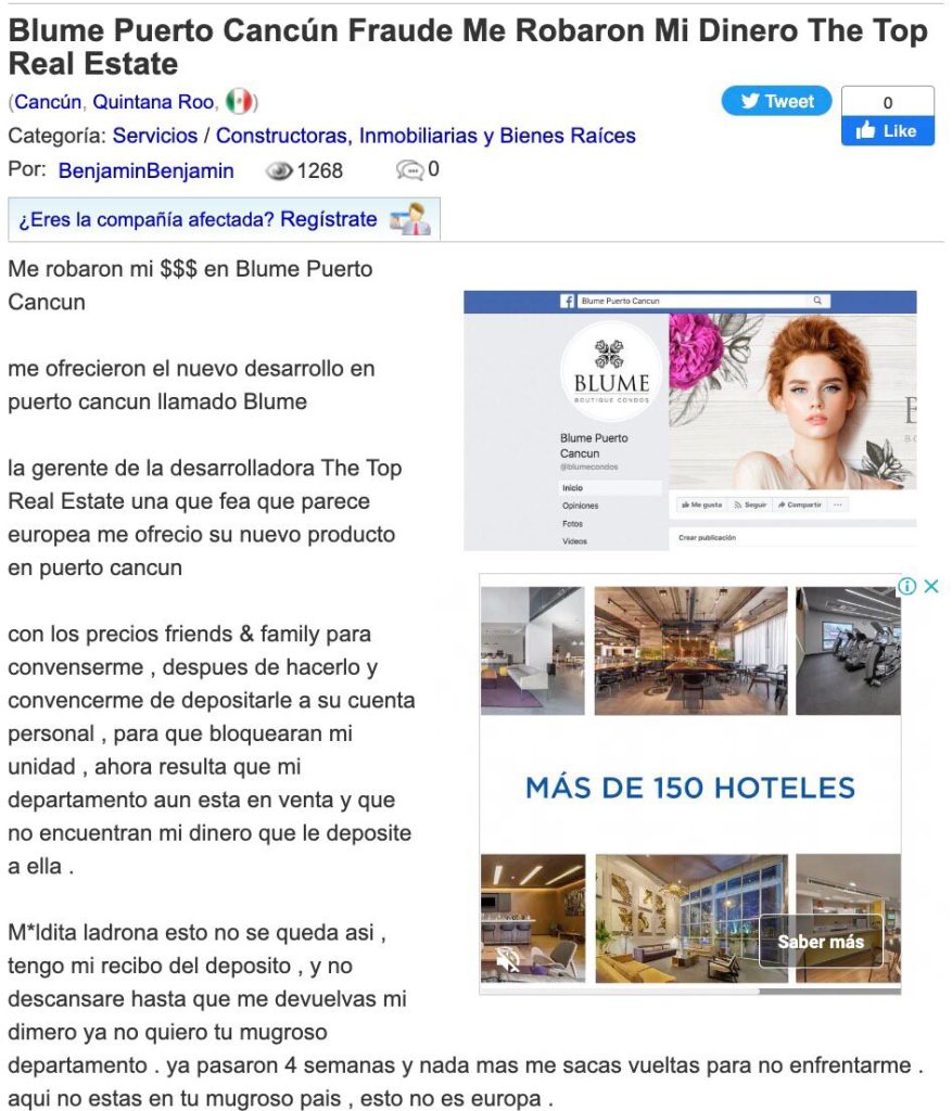 En redes sociales hay un post que a la letra dice: “Me robaron mi $$$ en Blume Puerto Cancún”…me ofrecieron el nuevo desarrollo en…Puerto Cancún llamado Blume, la gerente de la desarrolladora The Top Real Estate una que fea que parece europea me ofrecio su nuevo producto en Puerto Cancún con los precios friends & family para convenserme, después de hacerlo y convencerme de depositarle a su cuenta personal, para que bloquearan mi unidad, ahora resulta que mi departamento aun esta en venta y que no encuentran mi dinero que le deposite a ella…M*Idita ladrona esto no se queda así tengo mi recibo del deposito , y no descansare hasta que me devuelvas mi dimero ya no quiero tu mugroso departamento. ya pasaron 4 semanas y nada mas me sacas vueltas para no enfrentarme aquí no estás en tu mugroso país , esto no es Europa”.