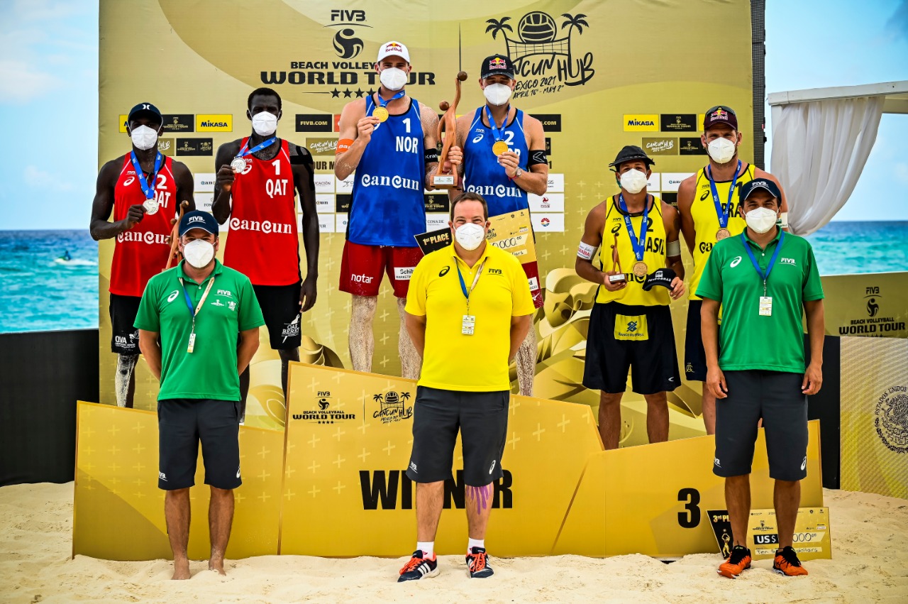 Cancún, Q. Roo, Lunes 26 de Abril de 2021, poderycrítica.- los llamados “vikingos del beach volleyball”, Anders Berntsen Mol y Christian Sandlie Sorum de Noruega, se convirtieron en doble medallistas de oro dentro del FIVB Beach Volleyball World Tour #CancúnHub2021 venciendo nuevamente al equipo sensación: Qatar.