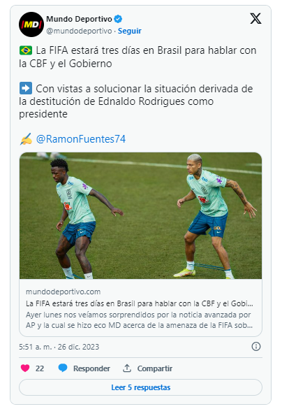 “Como se informó previamente a la CBF, la FIFA y la CONMEBOL enviarán una misión conjunta a Brasil durante la semana del 8 de enero para reunirse con las respectivas partes interesadas y examinar la situación actual y trabajar conjuntamente para encontrar una solución al actual estado de cosas con respecto a la aplicación de las normas de la CBF y su autonomía”.