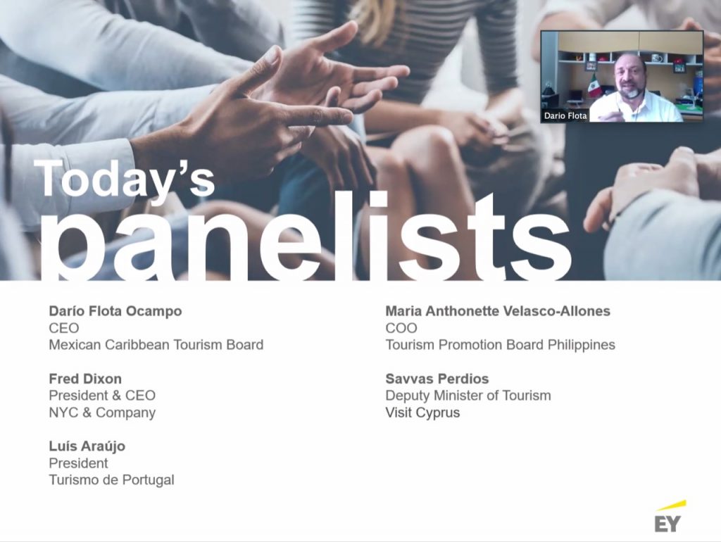 Recientemente, el director general del CPTQ, Darío Flota Ocampo participó como panelista en el webinar: «Viajes y Turismo: El Camino Hacia la Recuperación”, organizado por la compañía Ernst & Young, EY y WTTC – Consejo Mundial de Viajes y Turismo presidido por Gloria Guevara.