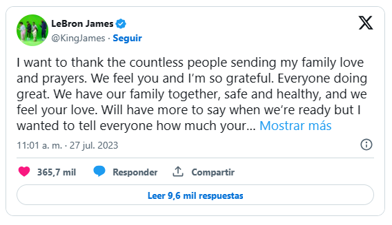«Quiero agradecer a todas las personas que han enviado amor y oraciones a mi familia. Todos estamos bien. Tenemos a nuestra familia reunida, segura y saludable, y sentimos su amor. Tendremos más que decir cuando estemos listos, pero quería decirles a todos lo mucho que su apoyo ha significado para todos nosotros», dijo el cuatro veces campeón de la NBA en una publicación en redes sociales.