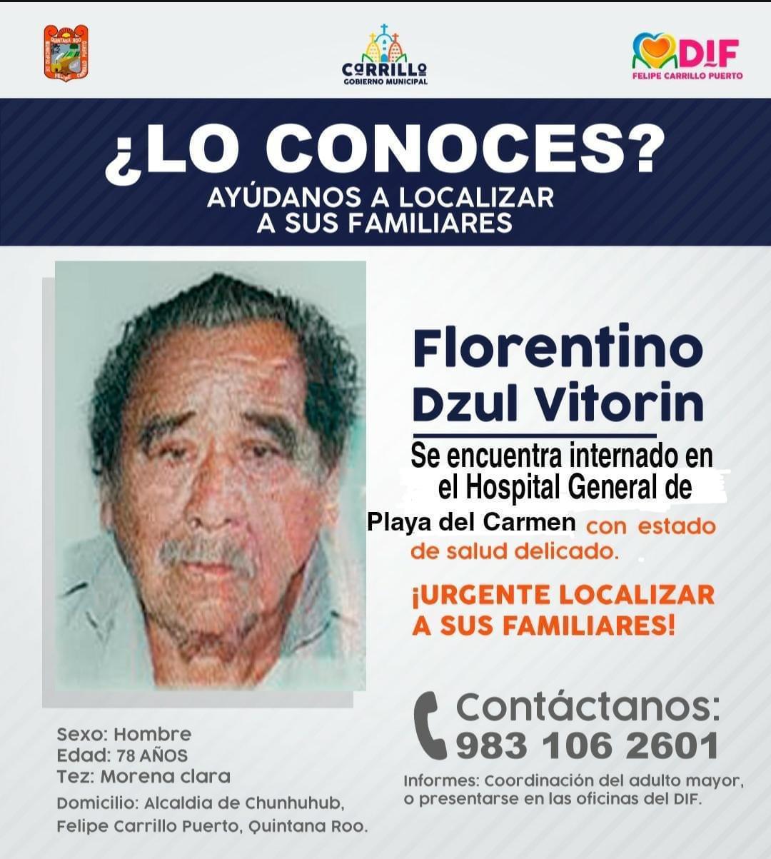 Felipe Carrillo Puerto, Q. Roo, Miércoles 10 de Febrero de 2021, poderycrítica.- El Sistema para el Desarrollo Integral de la Familia (DIF) del Ayuntamiento de Felipe Carrillo Puerto emitió una alerta para ubicar a los familiares de un adulto mayor que se encuentra internado en el Hospital General de Playa del Carmen.