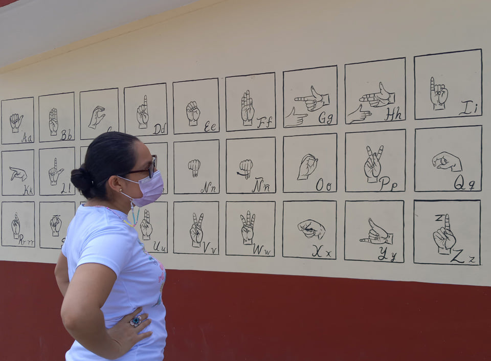 Dijo que la artista Damaris Alejandra Moo Zamora realiza la pinta del abecedario de lenguaje de señas en la barda del jardín de niños “José María Morelos”, en el centro de Kantunilkín, y buscan pintar otras en puntos estratégicos para que el mensaje le llegue a toda la comunidad.