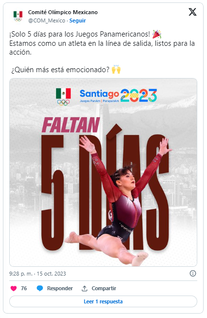 «Se tiene visualizado conseguir el 70 por ciento de esas plazas», estableció Platas. Es decir que el objetivo de México en la capital chilena es asegurar unos 25 lugares para París-2024.