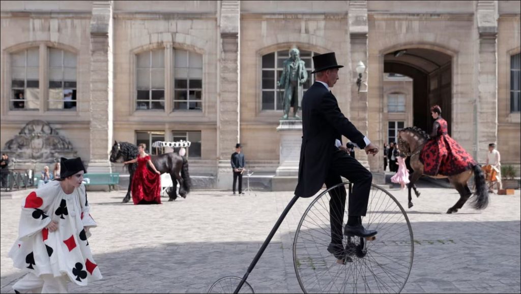 En el patio empedrado de una gran casa histórica, un saxofonista tocaba sobre unos escalones de piedra mientras un gran caballo estaba a sus pies. Entonces una damisela descendió desde dos puertas de madera tallada, luciendo un vestido de terciopelo rojo brillante con una falda voluminosa, para llevarse el caballo. Un bufón apareció con un traje blanco amorfo con motivos de naipes, mientras que una modelo con coletas y un vestido rosado texturizado con mangas cortas ofrecía algodón de dulce. La falda de la modelo, con un corte lateral y una ligera caída, tenía pliegues pesados que se movían con un contoneo estiloso.