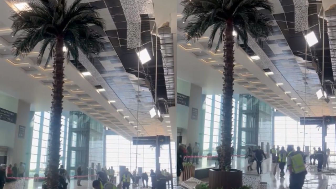 En un video publicado por un usuario de X se muestra al menos dos lámparas que cuelgan del techo descubierto en algunos metros, mientras personal del aeropuerto y de la Guardia Nacional (GN) hacen a un lado los restos del plafón que colapsó.