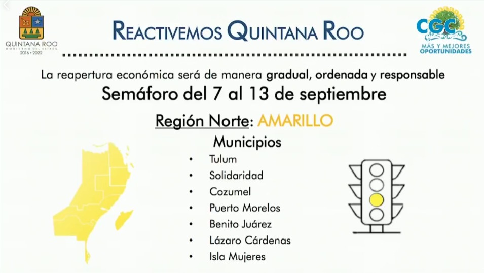 El color amarillo será para los municipios de Benito Juárez, Solidaridad, Cozumel, Lázaro Cárdenas, Isla Mujeres, Puerto Morelos y Tulum.