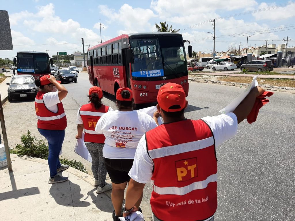 Cancún, Q. Roo, sábado 17 de abril de 2021, poderycrítica.- Brigadas del Partido del Trabajo (PT) caminan por las calles de Cancún promocionando a la Coalición «Juntos Hacemos Historia».