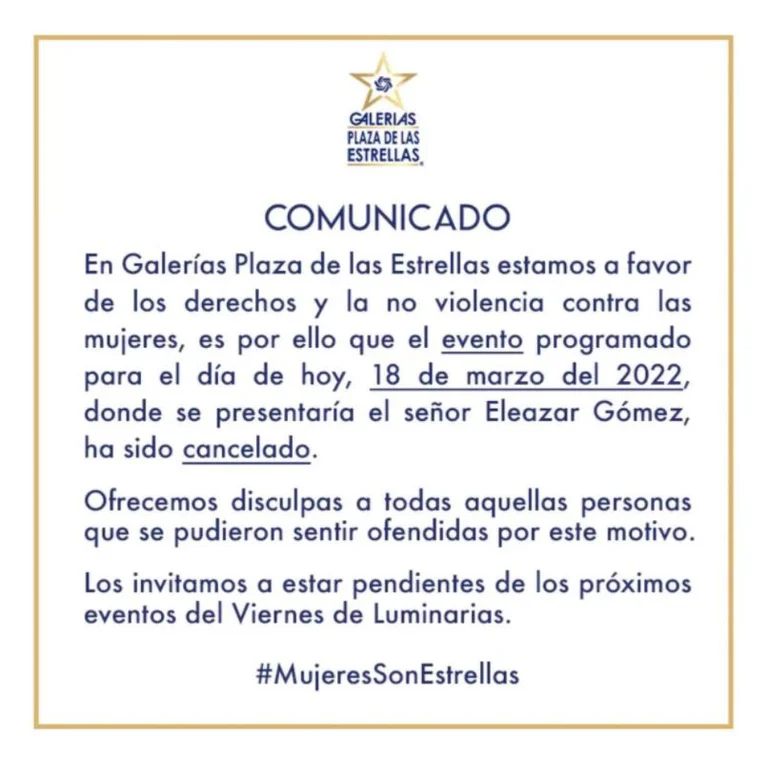 PODER Y CRÍTICA | REDACCIÓN | Organizadores de Galerías Plaza de las Estrellas lanzaron un comunicado en donde se disculpan por haber promocionado un evento en el que se daría un reconocimiento a Eleazar Gómez y anunciaron la cancelación del mismo.