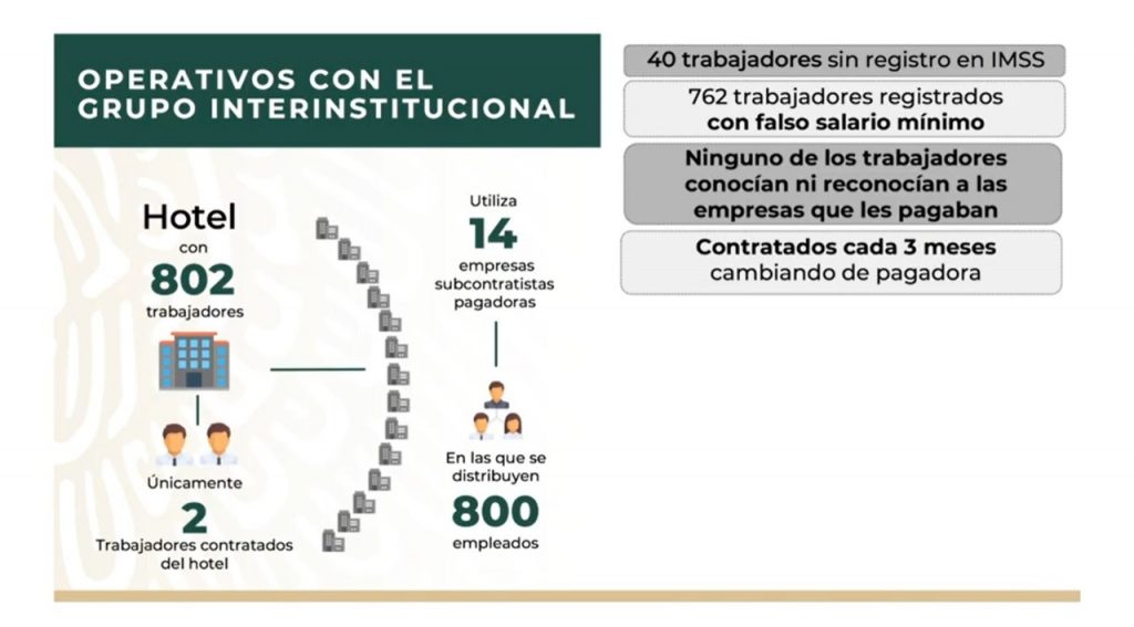 Se detectaron solo en ese centro de hospedaje, del que no dijo el nombre, 14 empresas pagadoras y los empleados no sabían qué empresa les pagaba, además de que todos estaban obligados a contratar cada tres meses con diferentes empresas pagadoras.