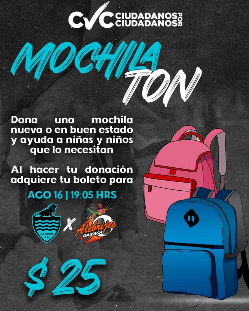 “Para esta campaña, del ‘Mochilatón’, nos apoyaron el equipo y directivos de Cancún FC, así que, asistan al partido el día 16 de agosto contra Oaxaca y donen una mochila, ya que obtendrán un precio especial”