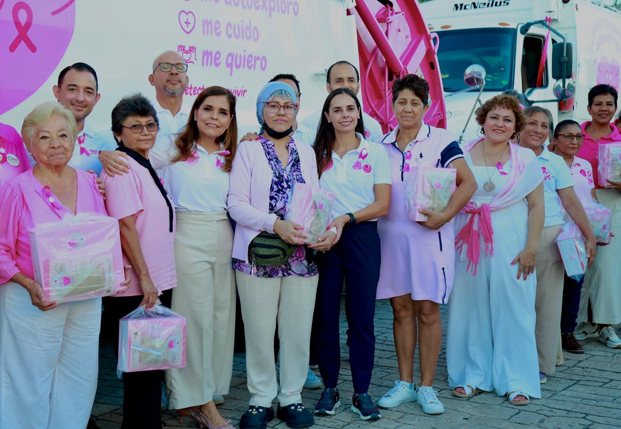 Poder y Crítica | Redacción | En el marco del mes de sensibilización sobre el cáncer de mama, la Presidenta Municipal, Ana Paty Peralta y la titular honoraria del Sistema para el Desarrollo Integral de la Familia (DIF) Quintana Roo, Verónica Lezama Espinosa, dieron el banderazo de salida de dos camiones recolectores rotulados en color rosa de la empresa Red Ambiental y encabezaron la entrega de 23 prótesis mamarias externas y brasieres ortopédicos a mujeres beneficiarias de diversas asociaciones civiles, como parte de la quinta edición de la  campaña “Detectar es vivir: autoexplórate”.