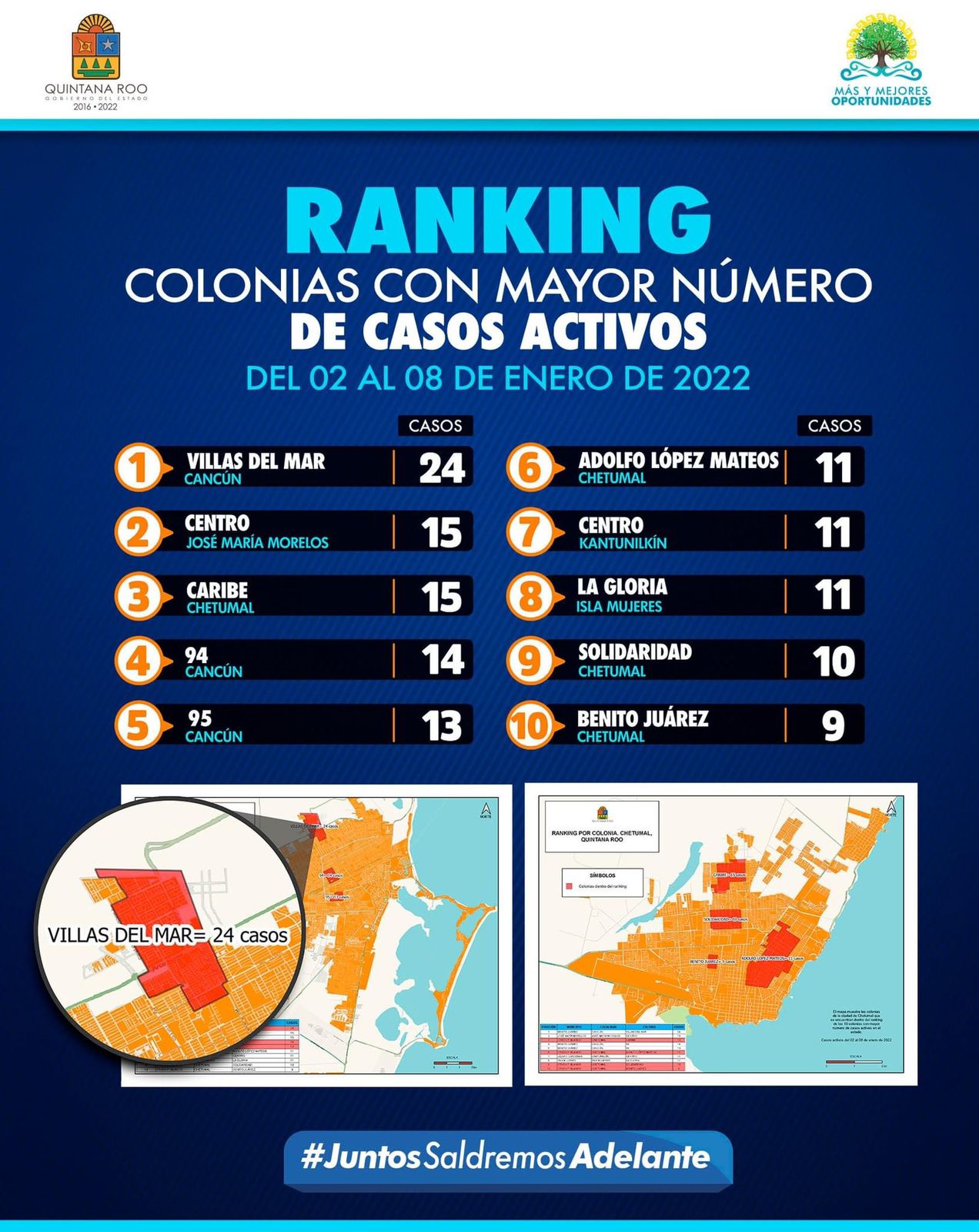 6.- La colonia Adolfo López Mateos en la ciudad de Chetumal con 11 casos activos de COVID-19.