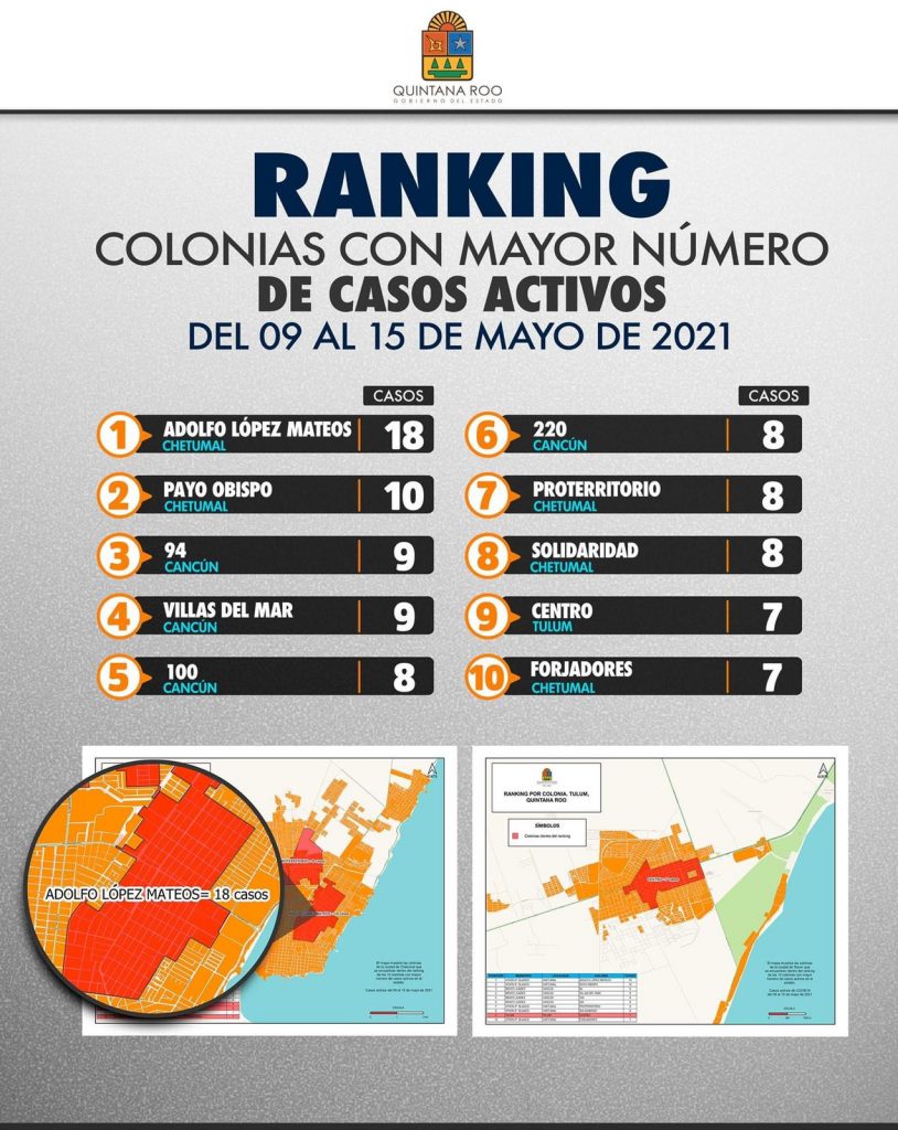 Se informó que hay un disparo de contagios por COVID 19 en las ciudades de Cancún y de Chetumal que las coloca como epicentros del ranking estatal de las colonias del estado con mayor reporte de contagios en la semana del 09 al 15 de mayo y cuyos datos son los siguientes:
