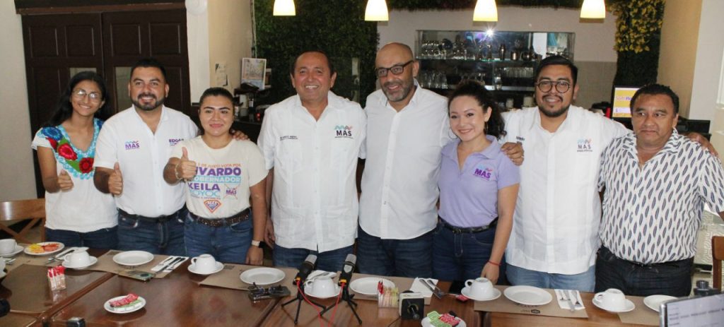 PODER Y CRÍTICA | SAMUEL CAAMAL | Arropado por el representante jurídico del Movimiento Auténtico Social (MAS), César Cortés, candidatos a diputados y la dirigente municipal Jacqueline Ávila, el candidato a Gobernador Josué Nivardo Mena Villanueva, reveló que su proyecto sigue “más sólido que nunca”, esto luego de que la fundadora del partido Cecilia Marín Loria Marín declinara a favor de la candidata a gobernadora Laura Fernández Piña.