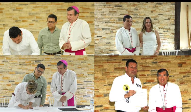 PODER Y CRÍTICA | REDACCIÓN | Los candidatos al gobierno del estado de Tabasco, Javier May Rodríguez, Lorena Beaurregard de los Santos, Minés de la Fuente Dagdug y Juan Manuel Fócil, participaron en la firma del Compromiso Estatal por la Paz propuesto por la Iglesia Católica.