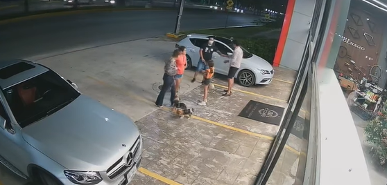 En el video, una familia compuesta de un hombre, una mujer, tres niños e incluso dos perritos, estaban parados en el estacionamiento de una tienda, al parecer de muebles, en la Supermanzana 9.