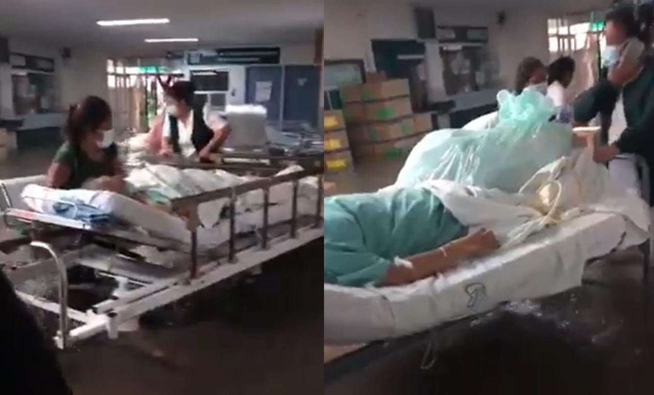 En uno de los videos compartidos se observa un hospital, supuestamente del IMSS, en donde enfermeras intentan sacar a los pacientes en camillas, en medio de la inundación.