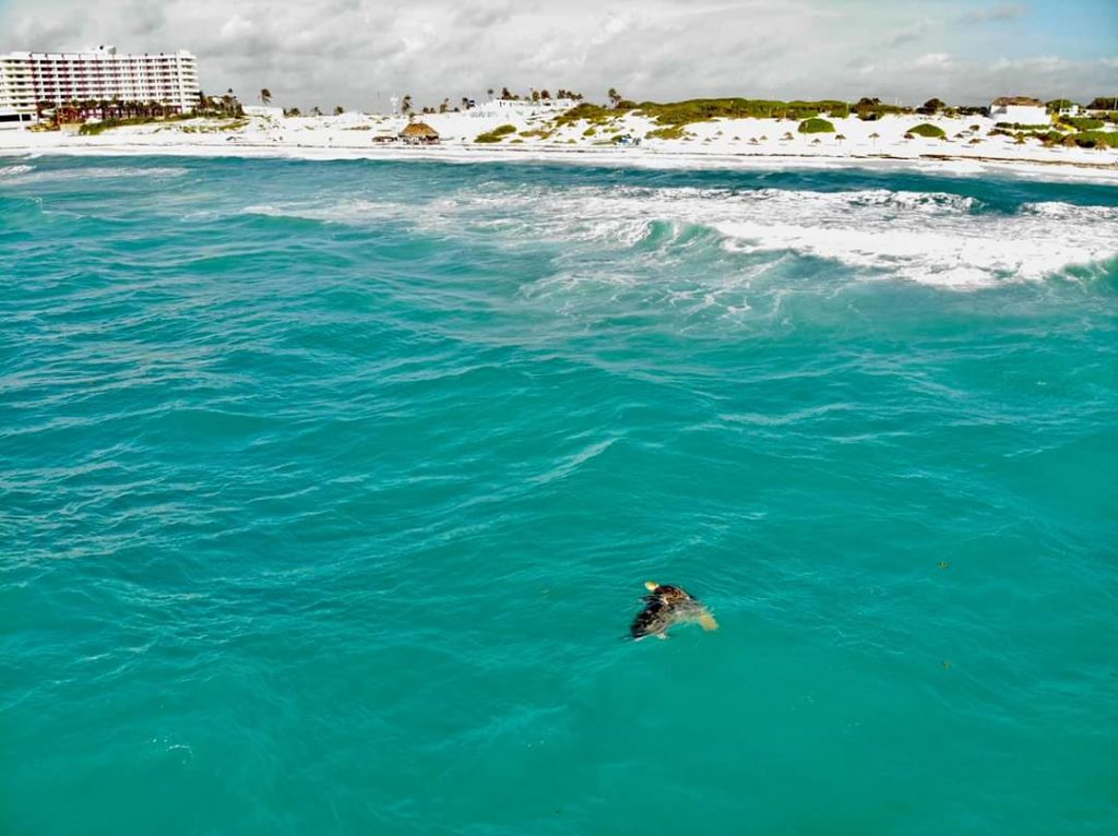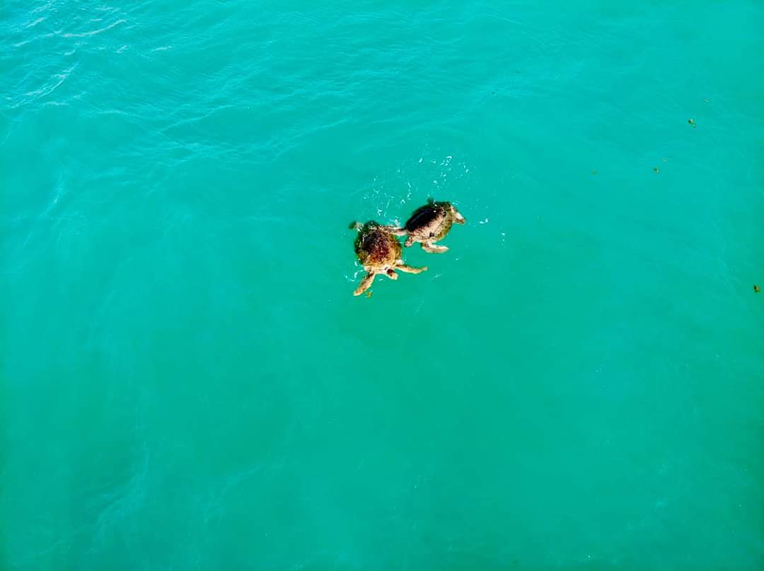 Cancún, Q. Roo, Martes 09 de Junio de 2020, poderycrítica.- Esta mañana una pareja de tortugas marinas fue captada por dron frente a Playa Delfines, en Cancún.