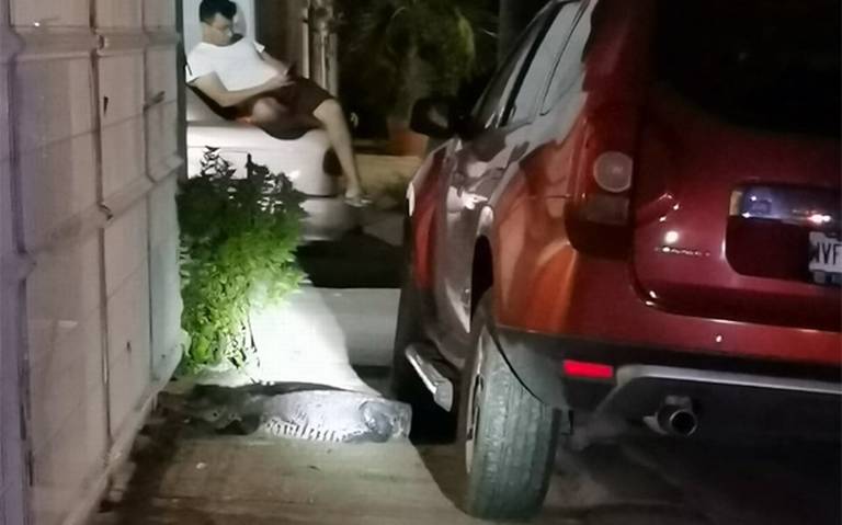 Un video difundido por un medio de comunicación muestra al cocodrilo sobre la banqueta, justo al pie de un vehículo, y al fondo se puede apreciar a una persona encima de un auto distraído mientras revisaba su teléfono móvil.