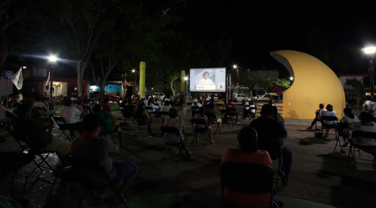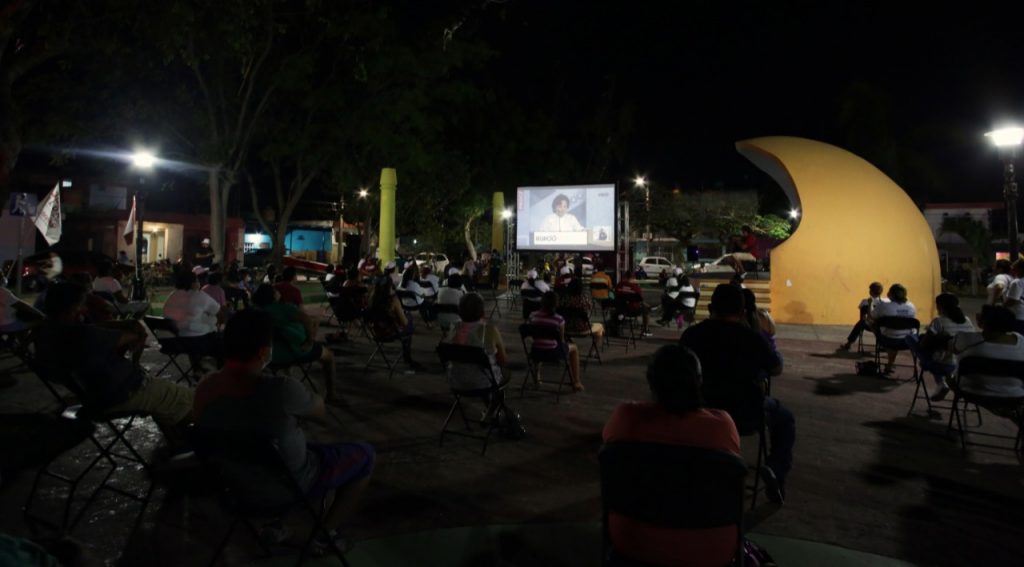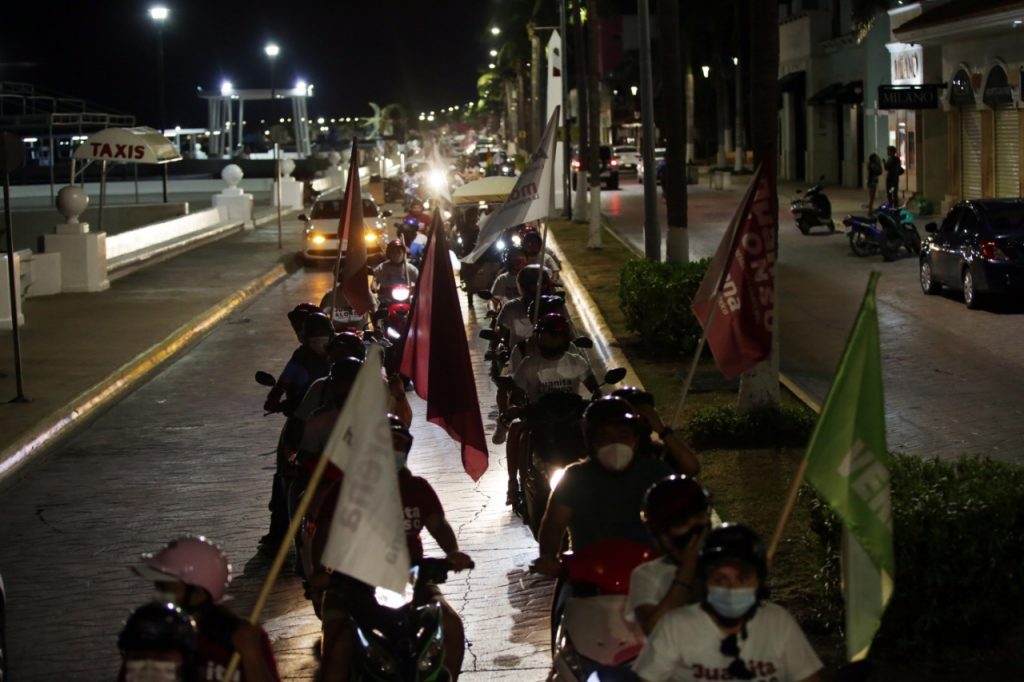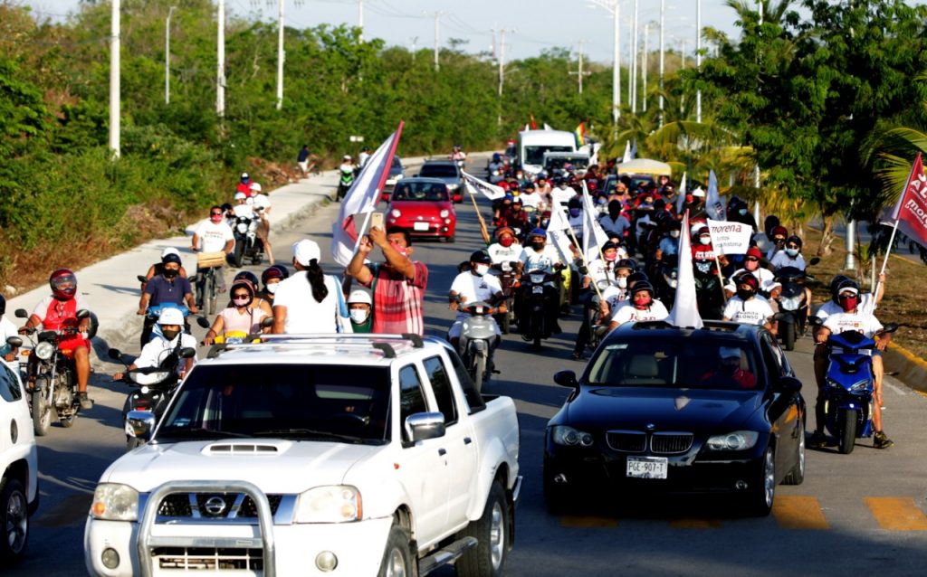 Los participantes de la caravana, cumpliendo con las medidas protocolarias de salud, portaron cubrebocas y tomaron medidas de sana distancia al concentrarse sobre la 65 avenida con esquina Boulevard Aeropuerto para brindar su apoyo a Juanita Alonso candidata de la coalición “Juntos Hacemos Historia en Quintana Roo”, así como en el parque de “La Concha Acústica” donde escucharon el debate ofrecido por el Instituto Electoral de Quintana Roo (IEQROO).