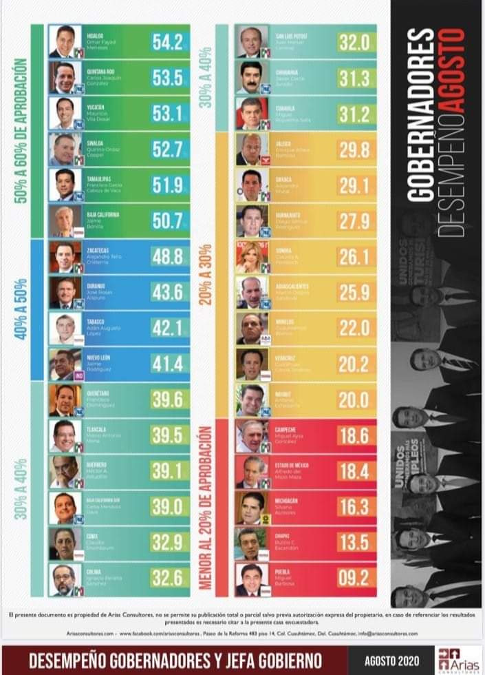 Chetumal, Q. Roo, Lunes 07 de Septiembre de 2020, poderycrítica.- En agosto, el gobernador Carlos Joaquín González fue el segundo mejor evaluado en el país. Con una aprobación del 53.5%, el gobernador Carlos Joaquín es el segundo gobernador mejor evaluado en agosto, de acuerdo con la encuesta de desempeño publicada por Arias Consultores
