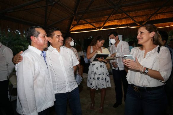 Seguidamente el gobernador Carlos Joaquín se trasladó a la palapa del parque central de Bacalar donde acompañado del titular de la Secretaría Estatal de Turismo, Bernardo Cuesto Riestra y del edil bacalarense Contreras Méndez, atestiguaron la presentación del video del programa PROASTUR, así como un spot del lanzamiento de la tercera edición de la Convocatoria Premio a la Innovación y Diversificación Turística en el Caribe Mexicano 2022.