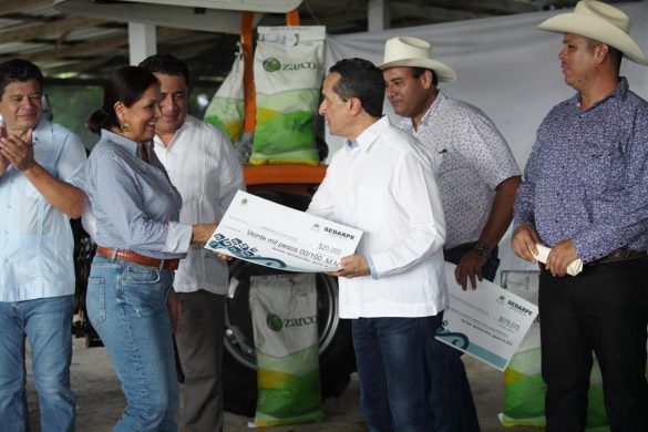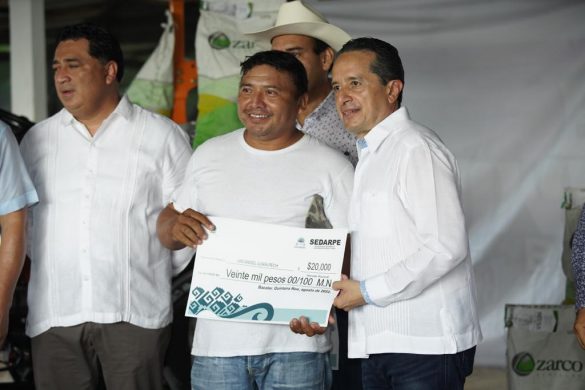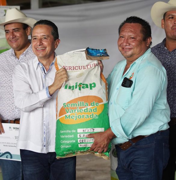 Carlos Joaquín en el recinto ferial de la Unión Ganadera “Ganaderos Unidos del municipio de Bacalar” entregó semillas de pasto mejoradas genéticamente, así como 12 toneladas de maíz criollo de las variedades Chichen Itzá y Sac Beh con categoría Certificada, con una inversión total de 526 mil pesos con aportación total estatal.