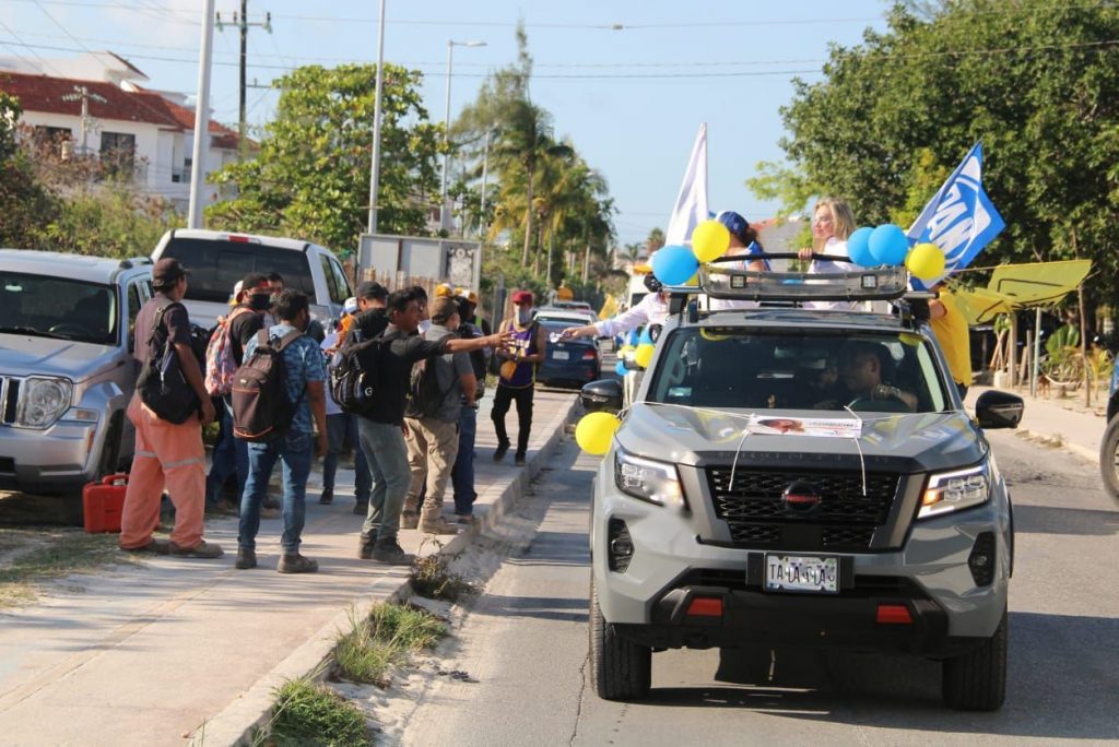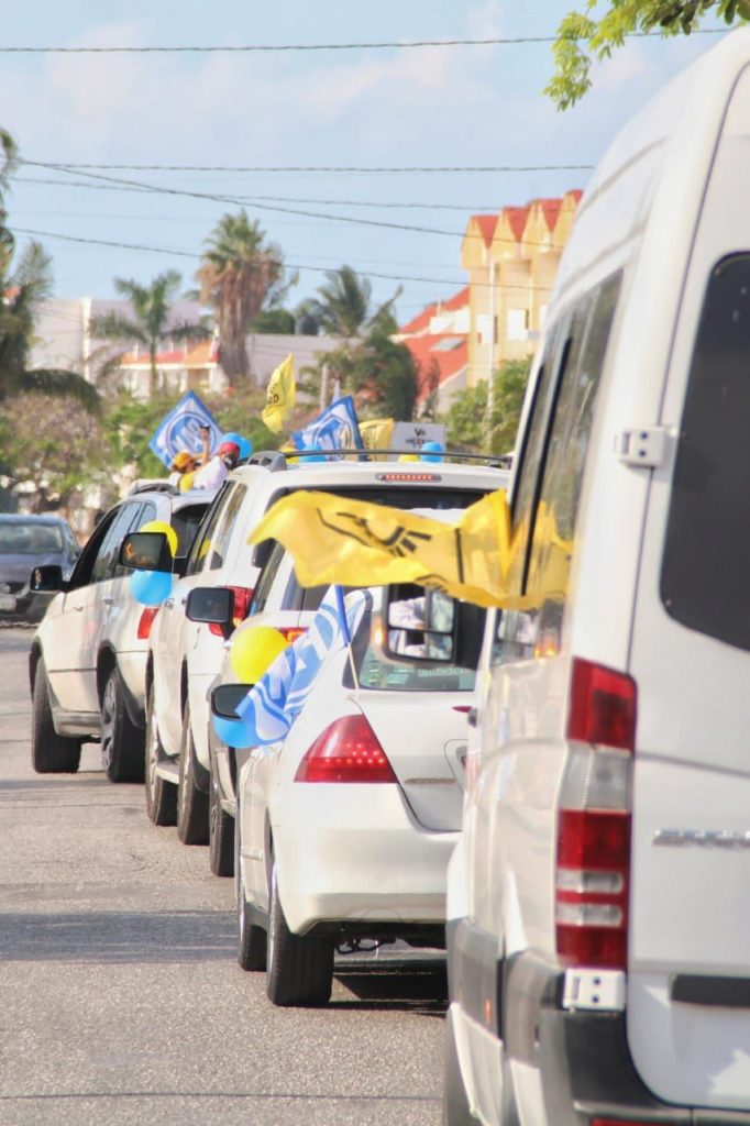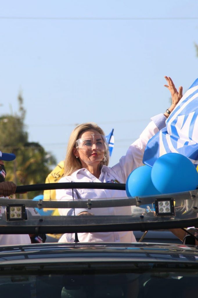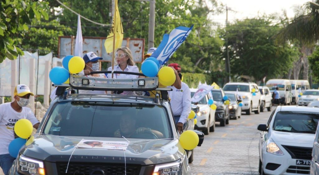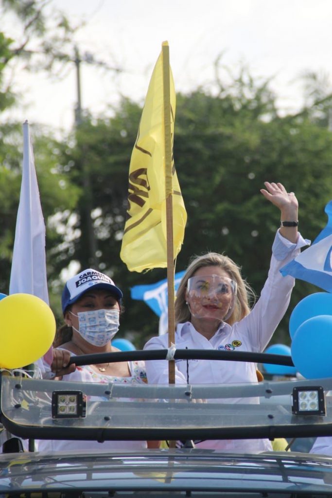 Cancún, Quintana Roo, viernes 28 de mayo del 2021, poderycritica.- Como parte de las actividades de cierre de campaña, Carmen Joaquín realizó caravana vehicular en la colonia Donceles 28 y Puerto Juárez, donde saludó a los ciudadanos que se acercaban a la abanderada de la coalición “Va por México” por del Distrito 04.