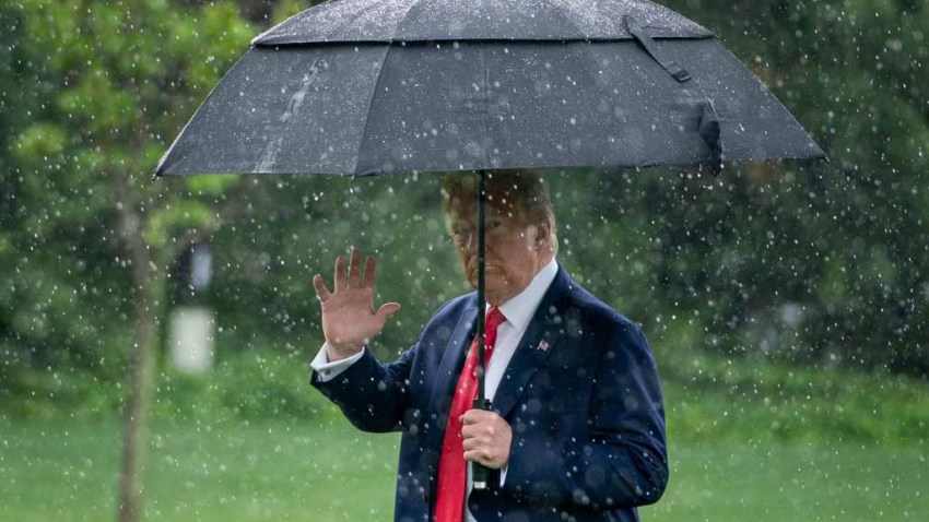 WASHINGTON, DC - JUNE 11: U.S. President Donald Trump walks to Marine One in the rain on the South Lawn of the White House on June 11, 2020 in Washington, DC. Later today, President Trump was scheduled to meet with pastors, law enforcement officials and small business owners at a church in Dallas, Texas. (Photo by Drew Angerer/Getty Images)