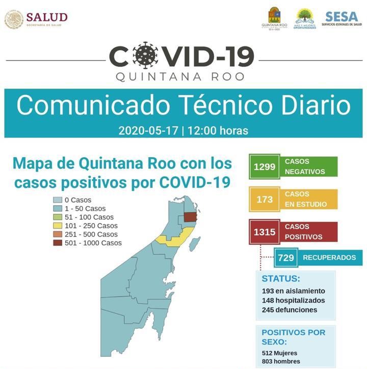 Chetumal, Q. Roo, Domingo 17 de Mayo de 2020, poderycrítica.- Este domingo, los casos de Covid 19 en Quintana Roo registraron mil 315 positivos, reportó la Secretaría de Salud en el Estado.