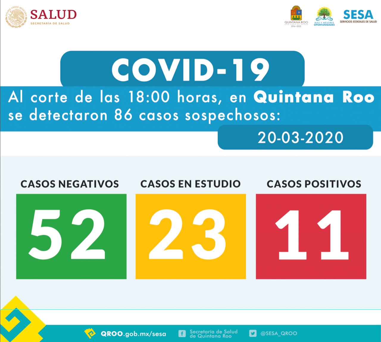 Cancún, Q. Roo, viernes 20 de marzo de 2020.- La cifra de casos positivos de coronavirus en Quintana Roo aumentó a 11, informó esta tarde en su corte de las 18 horas la Secretaría de Salud en el Estado.