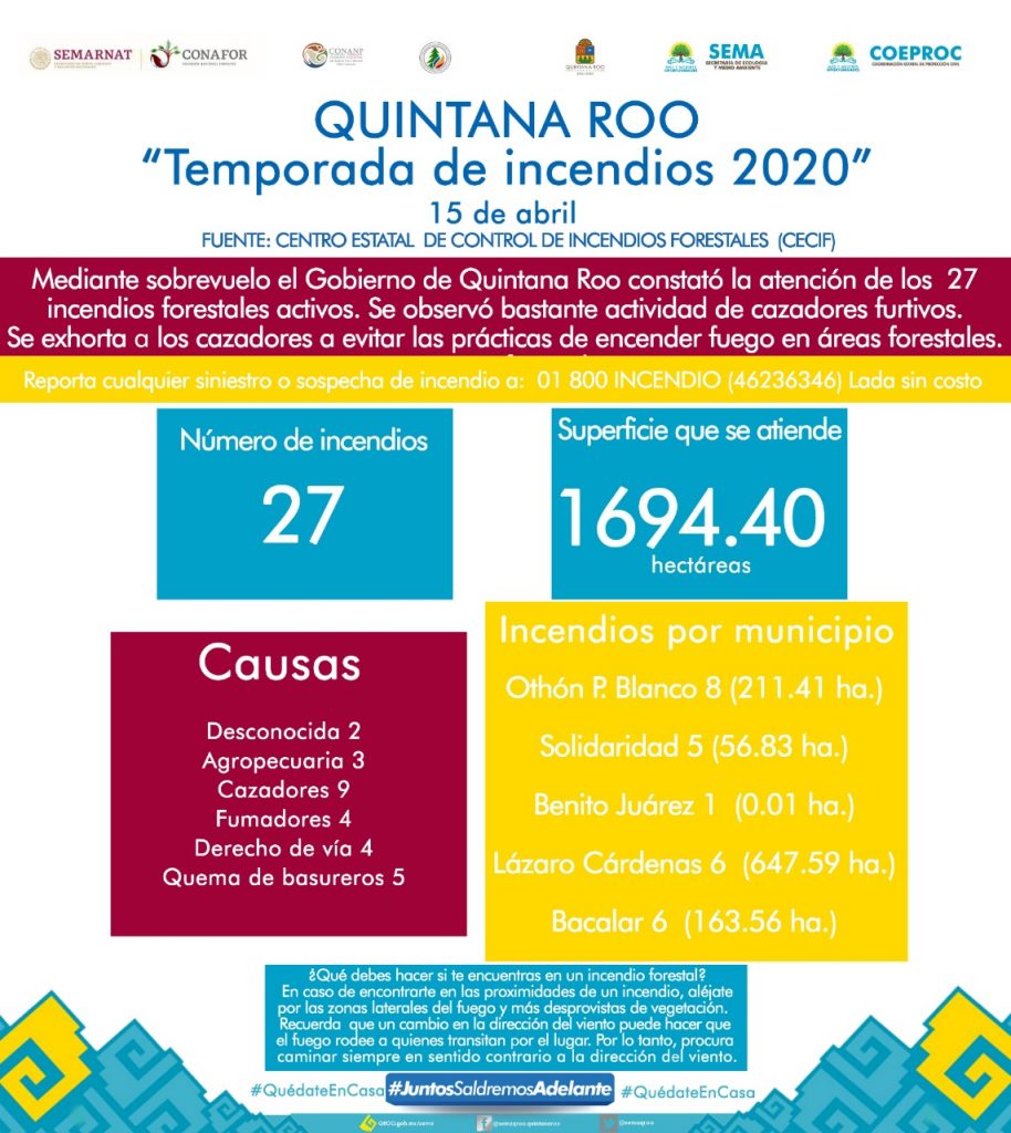 Mediante un sobrevuelo, el Gobierno de Quintana Roo constató la atención de 27 incendios activos en áreas forestales, reportó el Centro Estatal de Control de Incendios Forestales (CECIF).