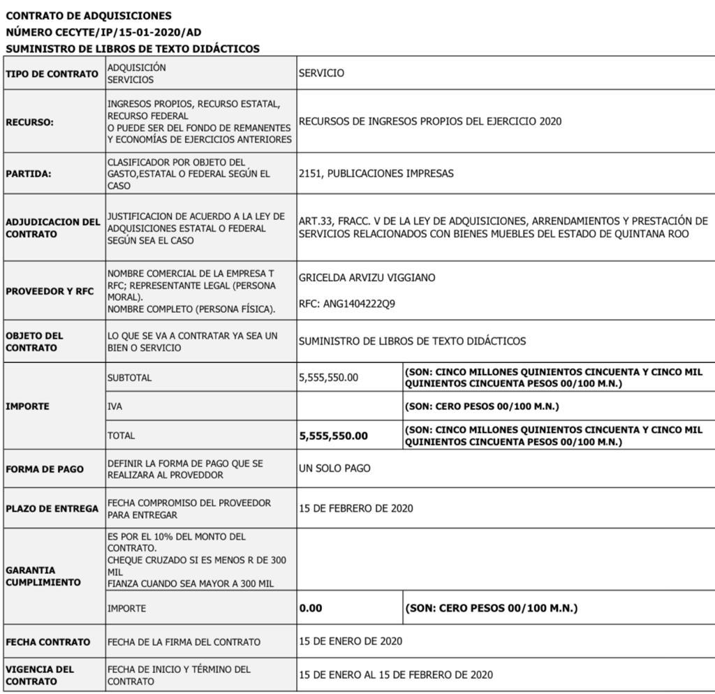 Posteriormente en el 2020 con el número de expediente CECYTE/IP/15-01-2020-AD, también se realizo la adquisición de manera directa de libros por un monto de $ 5,555,550.00, pero en esta ocasión se facturo con la represente legal de GRICELDA ARVIZU VIGGIANO quien mantuvo el RFC: ANG1404222Q9.