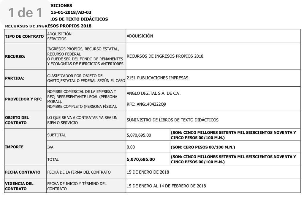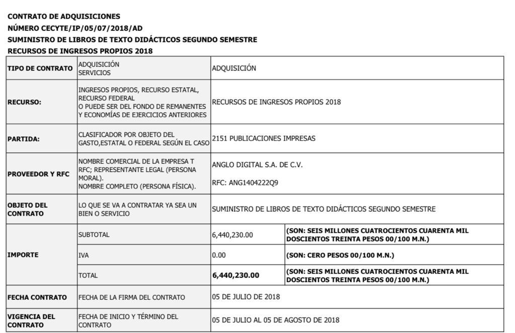 De acuerdo al expediente CECYTE/IP/15-01-2018-AD-03, se adjudicó de manera directa a la empresa ANGLO DIGITAL S.A. DE C.V. con el RFC ANG1404222Q9 la compra de libros didácticos por un monto de $ 5,070,695.00 y el mismo año con el número de expediente CECYTE/IP/05-07-2018-AD, de nueva cuenta se adjudico de manera directa a la misma empresa la adquisición de más libros con el monto de $ 6,440,230.00.