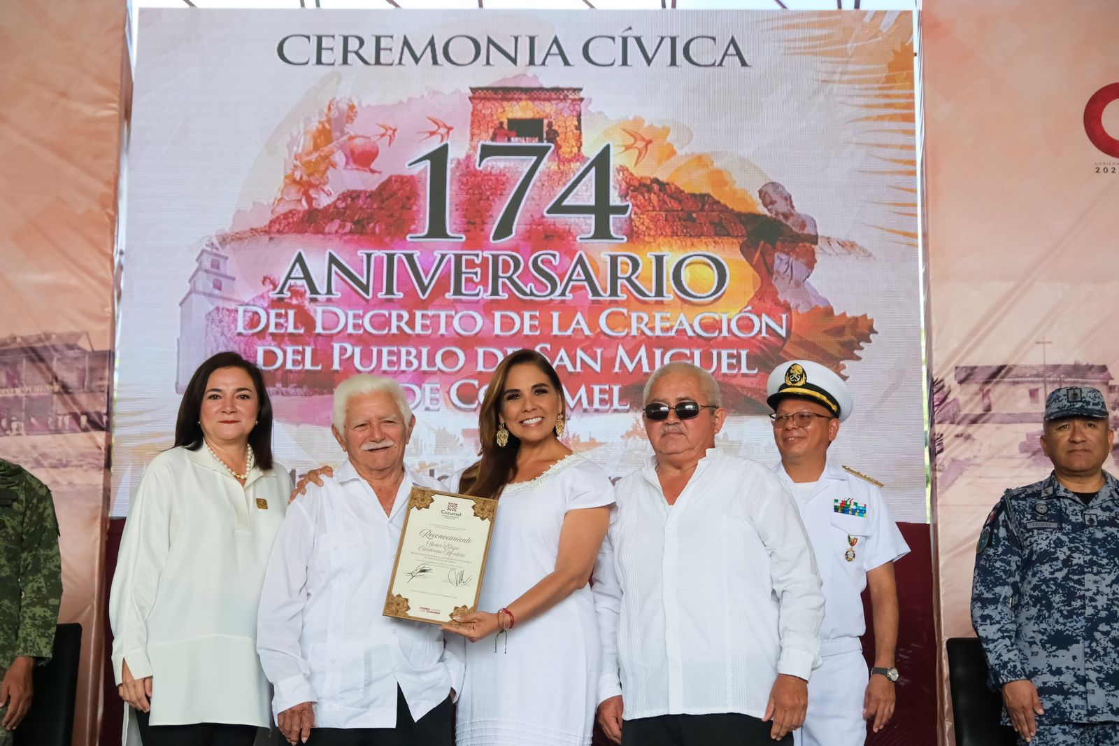 Tras escuchar al cronista vitalicio Vivas Valdez, la gobernadora Mara Lezama entregó reconocimientos a ciudadanos que con su trabajo y trayectoria han dado identidad a Cozumel: Pedro Mari Angulo, autor de la emblemática canción “Cumbia Cozumel”, por su invaluable aportación a la historia, cultura e identidad; Genny Aguilar Alcocer, fundadora de “Ladies Show”, por su invaluable aportación a la historia, cultura e identidad.